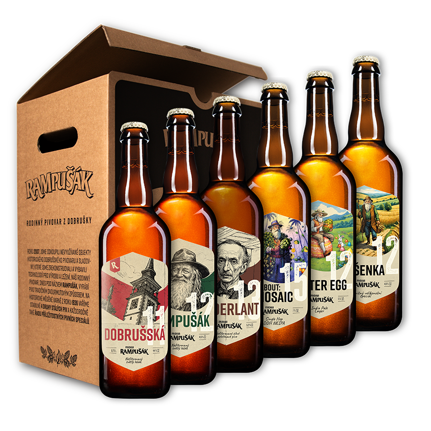 Exkluzivní výběr šesti různých piv v elegantních skleněných lahvích. Tento set je navržen pro ty, kteří chtějí prozkoumat kompletní nabídku dobrušského pivovaru – od tradičních ležáků přes silné speciály až po moderní, intenzivně chmelenou NEIPA.